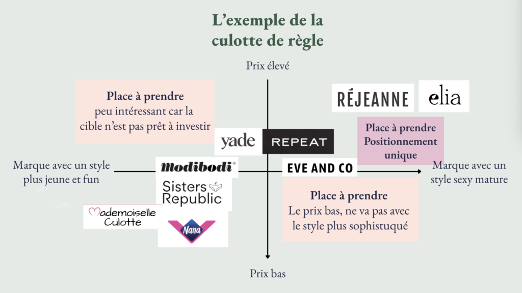 Reprenons l’exemple de la culotte menstruelle (mon exemple est hyper simplifié, attention). Sur mon graphique, je vois qu’il y a trois zones où je pourrais m’insérer :